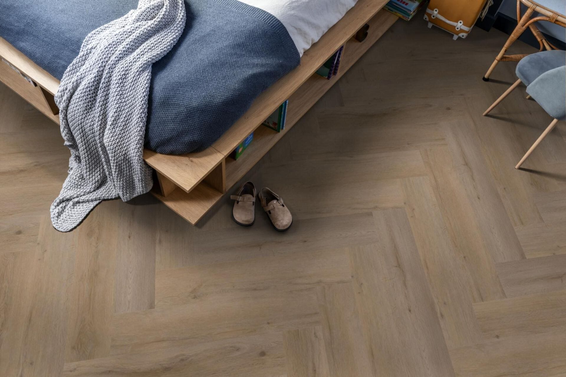 De Floors pvc plak visgraat vloeren worden volledig verlijmd op de ondergrond, wat zorgt voor een strakke, stille en stabiele afwerking. Alle varianten zijn 2,5 mm dik en hebben een sterke slijtlaag van 0,55 mm, waardoor de vloer uitstekend geschikt is voor intensief gebruik.